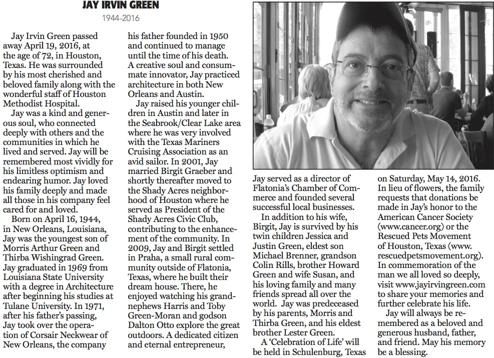 Jay Green's obituary was published on Sunday, May 1, 2016 in the following publications. (Click publication to view digital version.)